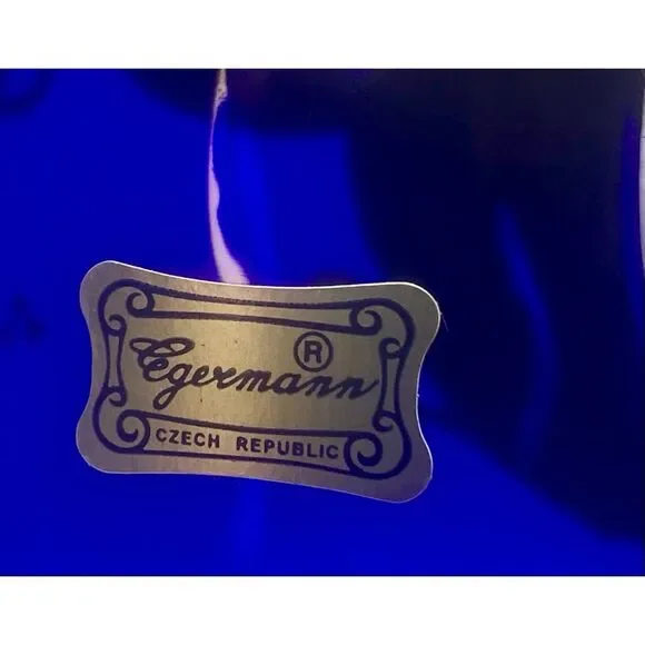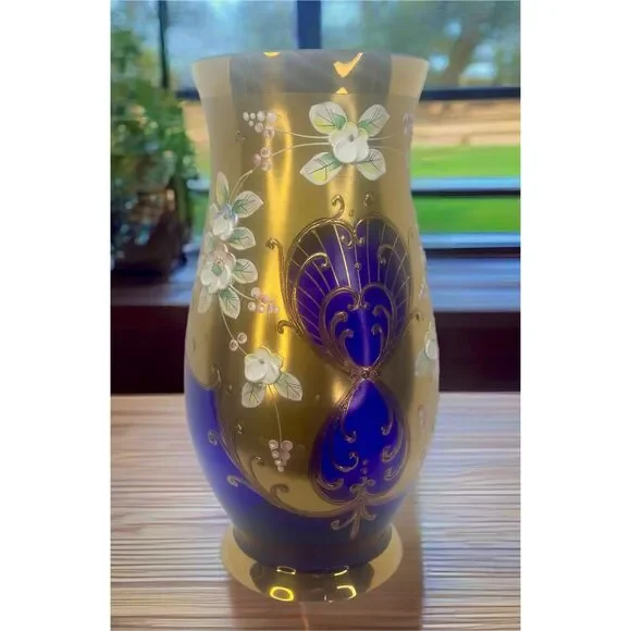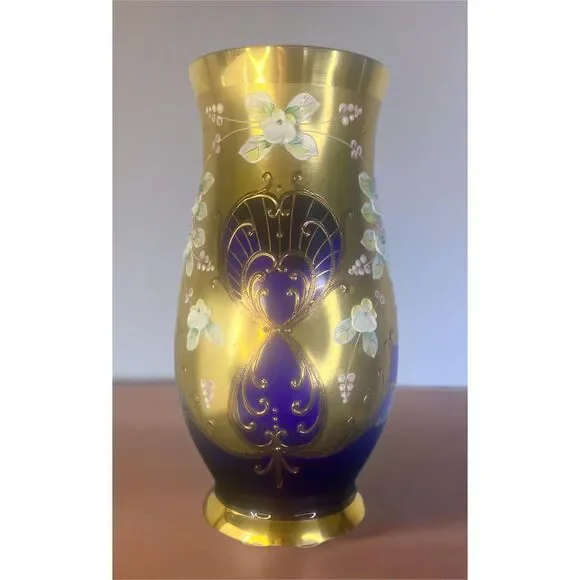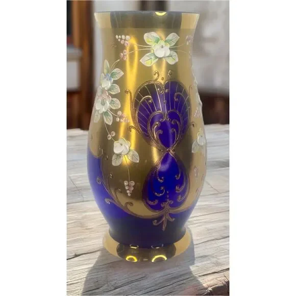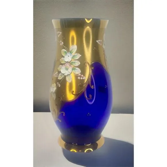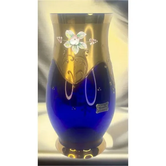 Vintage Egermann Czech Republic Cobalt Blue Vase with 24K Gold DetailingAdd a touch of timeless elegance to your home with this stunning vintage Egermann vase from the Czech Republic. Crafted from exquisite cobalt blue glass, this vase showcases the renowned Bohemian glass artistry that has been celebrated for centuries. The deep blue base is adorned with luxurious 24K gold accents, intricately hand-painted with floral motifs, giving it a regal and sophisticated appeal.The vase features delicate raised flowers in soft, pastel hues, bringing a vibrant contrast to the rich cobalt background and shimmering gold leaf designs. With its graceful curves and vintage charm, this piece is perfect for both functional use or as a decorative statement on its own.Whether you're a collector of fine glassware or seeking an elegant accent for your space, this Egermann vase is a must-have addition. H 8.25" W3.5"